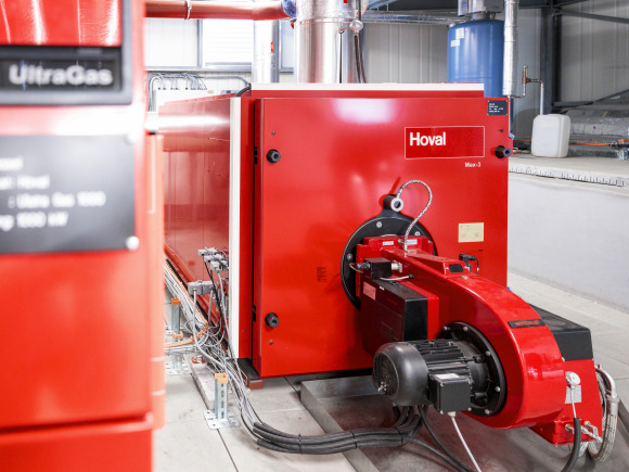 Steigt man auf das Dach des Gebäudes, offenbaren sich im Inneren der Heizzentrale die ganze Grösse und das Konzept der Wärmeversorgung im GZ Dielsdorf. Hier arbeitet ein riesiger Gas-Brennwertkessel UltraGas 1000 von Hoval und sichert die Heizwärme im ganzen Gebäude. Dazu Heinz Hitz, Technischer Verkaufsberater von Hoval: „In der Schweiz werden pro Jahr nur etwa 30 Anlagen dieser Grösse in Betrieb genommen.“