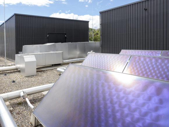 Zusammen mit den Solarpanels bildet der Gas-Brennwertkessel das Herz der Energieversorgung. Auf die Solarpanels angesprochen, meint Heinz Hitz: „Auch die hat Hoval geliefert. Es sind insgesamt 83 Stück UltraSol-Kollektoren mit einer Gesamtfläche von rund 200 m2.“ Er weist auch darauf hin, dass die Solaranlage mit einer Zentralventilregelung ausgestattet ist, um die unterschiedlichen Beschattungen und Energieleitstränge auszugleichen und die Austrittstemperatur des Wassers gleichbleibend zu regeln.