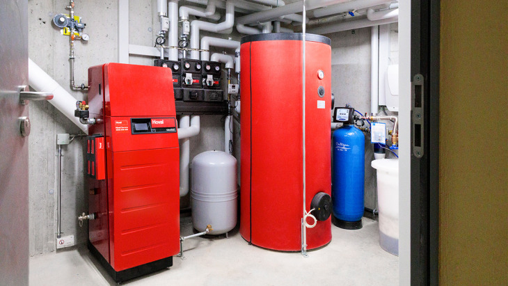 Bei der Frage der Heiztechnik und der Wahl von Hoval Produkten spielten zwei Faktoren eine Rolle. Zum einen verrichtete im alten Bauernhaus eine Ölheizung von Hoval sehr zuverlässig ihre Dienste. Zudem ist Roland de Stefani mit seinem Unternehmen RDS Fenster + Türen GmbH nach wie vor im Bausektor tätig. So lernte er Giuseppe Campanella, Technischer Verkaufsberater bei Hoval, kennen. Und nach einem gemeinsamen Besuch im Hoval Hauptwerk in Vaduz gab es für Roland de Stefani keine Zweifel mehr. „Die Produkte von Hoval sind technisch oberste Liga“, sagt er. Gemeinsam mit Giuseppe Campanella prüfte er daraufhin verschiedene Optionen der Heiztechnik. Erdsonden kamen aus Kostengründen nicht in Frage. Auf Wärmepumpen verzichtete Roland de Stefani, weil die Ausseneinheiten in seinen Augen nicht ins Gesamtbild der homogenen ländlichen Umgebung passten. Die Wahl fiel schliesslich auf eine zentrale Gasheizung mit einem 4,3 Kubikmeter fassenden Flüssiggastank im Erdreich des Geländes. Verarbeitet wird das Gas mit einem Brennwertkessel UltraGas 50 von Hoval. Dieser heizt und erzeugt Warmwasser – in Kombination mit einem Hoval Wassererwärmer ESSR 1000 – für insgesamt 1500 m2 Wohnfläche.