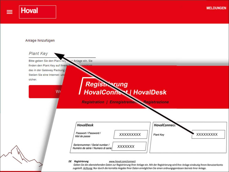Sie finden Ihren Plant Key auf dem Registrierungsblatt, welches Sie zusammen mit dem HovalConnect Gateway erhalten haben (siehe Abbildung). Sollten Sie das Registrierungsblatt nicht mehr finden können, wenden Sie sich bitte an den HovalConnect Service unter connect@hoval.com.