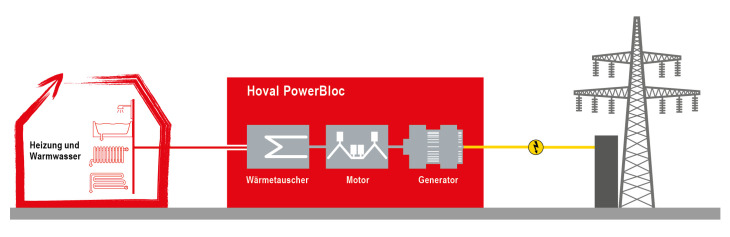 Hoval bietet standardisierte Gesamtlösungen, die praktisch jedes Bedürfnis und jede mögliche Anwendung abdecken. Die Leistungspalette reicht dabei von 20-520 kW. Das kompakte Erdgas-BHKW PowerBloc EG (20) als kleinstes Standardmodell erbringt eine elektrische Leistung von bis zu 20 kW und eine thermische Leistung von bis zu 43 kW. Sein Gesamtwirkungsgrad beträgt 103,2%. Mittelgrosse Gebäude wie Hotels und Schulen, aber auch Mehrfamilienhäuser sowie Gewerbe- und Industriebauten sind mit dem PowerBloc EG (20) bestens bedient. Die Leistungspalette von Hoval reicht bis 530 kW: Das BHKW PowerBloc (520) zum Beispiel bringt es auf maximal 520 kW elektrische Leistung und auf maximal 687 KW thermische Leistung. Er kann mit Erdgas oder Biogas betrieben werden und ist vor allem für grosse Objekte konzipiert.