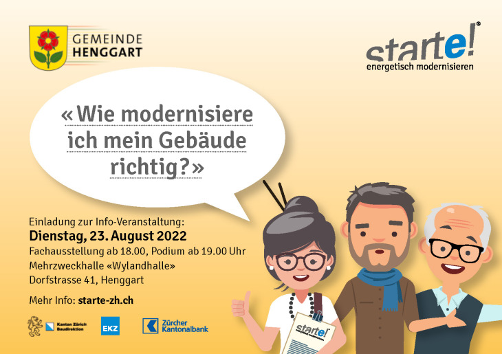 Wie modernisiere ich mein Gebäude richtig? Um diese Frage geht es an der starte! Veranstaltung am 23. August 2022. Starten Sie gemeinsam mit uns in eine energieffiziente Zukunft. Wie das geht? Wir zeigen es Ihnen. Egal, ob Sie Ihre Heizung sanieren müssen, die Fassade eine Modernisierung benötigt oder Sie Sonnenenergie nutzen möchten: Mit den Fachvorträgen des kantonalen starte!-Teams finden Sie vor Ort die richtige Lösung. Hoval steht den ganzen Abend für Fragen und Beratungen zur Verfügung - kostenlos und individuell für Sie, damit Hauseigentümer zukünftig richtig sanieren und Kosten sparen können!