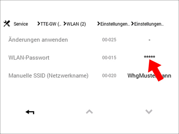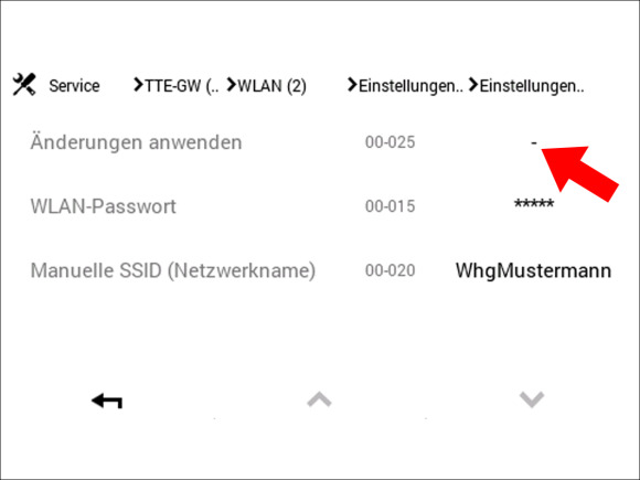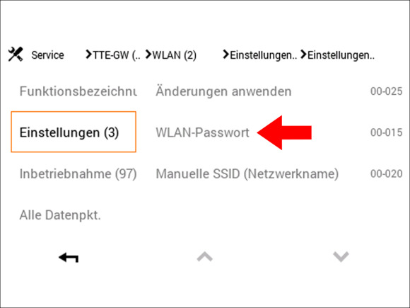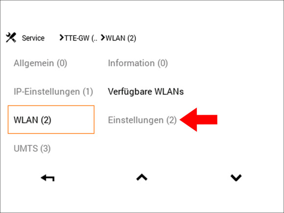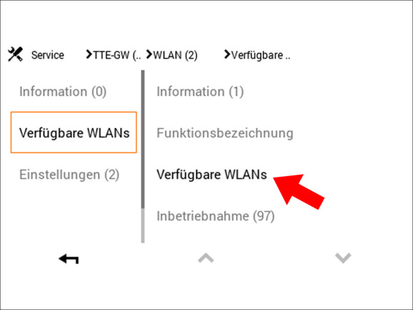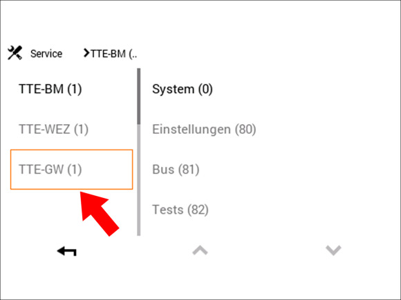 Remarque: si l'option «TTE-GW» ne devait pas être directement visible, cliquez sur la touche fléchée en bas à droite pour faire défiler la liste vers le bas jusqu'à ce que le point de menu «TTE-GW» s'affiche.