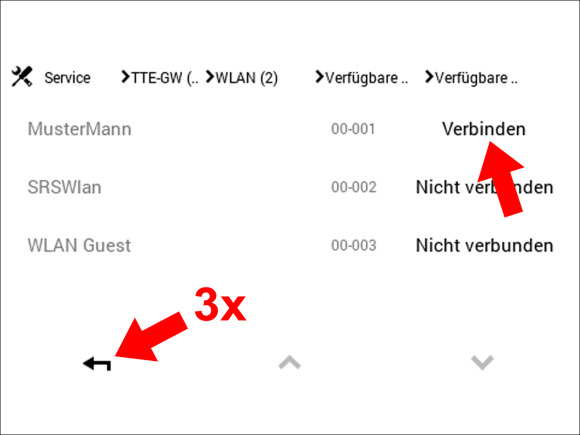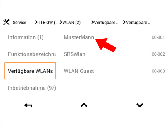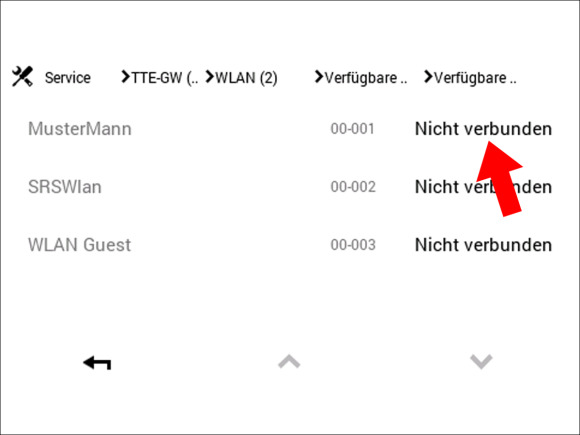 Remarque: si le WLAN de votre choix ne devait pas être directement visible, cliquez sur la touche fléchée en bas à droite pour faire défiler la liste vers le bas jusqu'à ce que le WLAN de votre choix s'affiche.