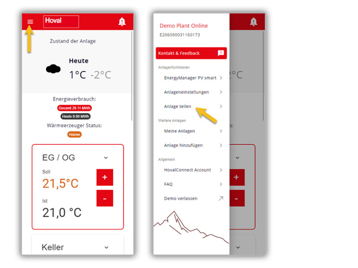 Les propriétaires d'installations ont désormais la possibilité de partager leur installation Hoval ou chacun de leurs circuits de chauffage avec d'autres utilisateurs privés HovalConnect. Les utilisateurs de l'application trouveront cette nouvelle fonction dans le menu, sous «Partager l'installation».