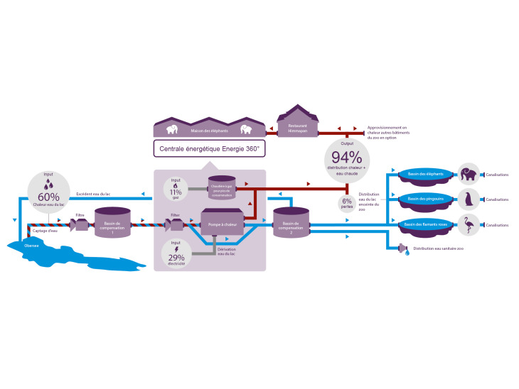 Pour pouvoir respecter les consignes et les délais serrés tout en préservant la faune et la flore, les conduites ont été enterrées selon le principe du forage à circulation directe. L’eau est extraite à quelque 340 mètres du rivage à une profondeur de cinq à sept mètres. Après un filtrage sommaire, elle est ensuite acheminée vers le bassin de compensation dans l’enceinte du zoo. De là, elle est une nouvelle fois filtrée puis amenée par une pompe vers la pompe à chaleur. Elle constitue ainsi la source de chaleur principale de l’installation de chauffage. Elle est ensuite transportée dans un autre bassin de compensation. De là, soit elle retourne de manière naturelle au lac soit elle est utilisée pour le remplissage des bassins des éléphants, pingouins et autres animaux soit encore intégrée au réseau d’eau sanitaire pour le lavage des installations du zoo. Le système de chauffage consiste actuellement en une pompe à chaleur d’une puissance de 280 kW qui alimente la maison des éléphants et le restaurant Himmapan en eau chaude et en chaleur. La centrale d’énergie peut héberger deux autres pompes à chaleur de même puissance ainsi qu'une autre chaudière à gas à condensation Hoval - ce qui laisse envisager un agrandissement modulaire du système. Trois accumulateurs de 6800 litres chacun ont été aménagés pour stocker l’énergie thermique. Une chaudière à gaz à condensation Hoval vient en renfort pour les pics de demande et sert de système palliatif. L’installation a été intégralement planifiée, réalisée et financée par Energie 360° en tant qu’entrepreneur. Le contrat s’étend sur 30 ans – période durant laquelle Energie 360° assure le fonctionnement et l’entretien ainsi que la fourniture d’énergie et d’eau 24 heures sur 24.
