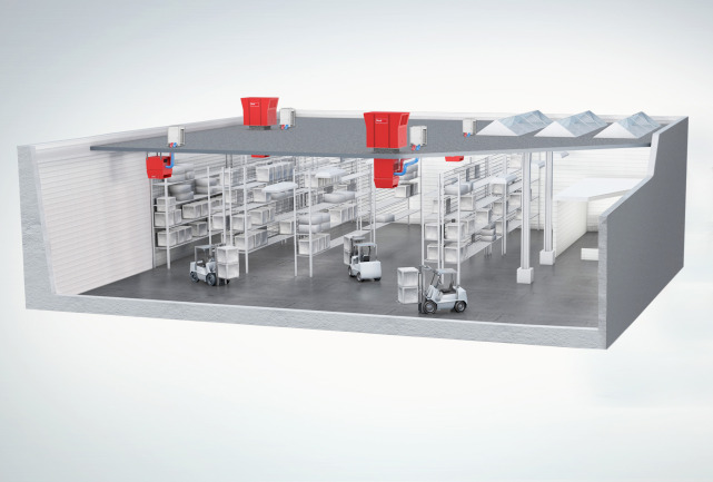 Vous souhaitez utiliser chaque mètre carré de votre entrepôt? Oubliez les volumineux conduits d’alimentation et d’évacuation de l’air, que l'on doit de plus nettoyer régulièrement! Désormais, les systèmes de climatisation d’entrepôt décentralisés d’Hoval remplacent les installations de climatisation centralisées complexes. Ils peuvent même être combinés avec des pompes à chaleur, ce qui rend tout local technique ou réseau hydraulique superflu. Et si vous agrandissez votre entrepôt, il suffit d'ajouter quelques appareils supplémentaires.
