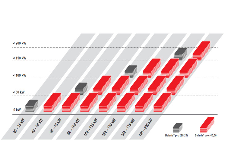 La Belaria pro est facile à monter en cascade avec ses quatre niveaux de puissance (20, 25, 40 et 50 kW). Il est ainsi possible d’obtenir des puissances système finement échelonnées de 20 à 200 kW. Les planificateurs ont donc une solu-tion adéquate pour répondre à toutes les exigences des constructions résidentielles et commerciales. Grâce à une tech-nologie d’onduleur modulant, la puissance précise requise à un moment donné est toujours disponible. Résultat: un fonc-tionnement efficace avec des coûts d’exploitation réduits.