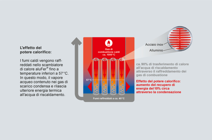 Nelle caldaie a gas convenzionali, l’energia termica dei gas di scarico viene ceduta all’acqua di riscaldamento attraverso uno scambiatore di calore, permettendo in tal modo il raffrescamento dei gas di scarico fino a una determinata temperatura (ad esempio 180 °C). Nella termodinamica questa parte di energia viene chiamata «calore percepibile». I gas di scarico contengono anche un’altra parte di energia termica, detta «calore latente» (ossia nascosto), presente nel vapore acqueo prodotto durante la combustione. Nelle caldaie a gas convenzionali questa energia viene irrimediabilmente dispersa attraverso il camino.