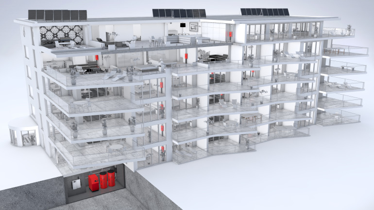 Un investitore cerca soluzioni il più possibile semplici, poco onerose e dal funzionamento economico, che tuttavia garantiscano un’efficienza elevata e utilizzino energia rigenerativa nel rispetto delle prescrizioni delle nuove leggi in materia energetica. Tutto questo è possibile! La soluzione standard di Hoval per complessi residenziali con fino a 25 unità abitative combina una caldaia a condensazione a gas UltraGas a collettori solari termici UltraSol per il riscaldamento dell’acqua e degli locali. La soluzione comprende inoltre un sistema per acqua sanitaria TransTherm aqua F, che con UltraGas crea un binomio geniale in termini energetici, e il distributore per riscaldamento TransShare, che riduce gli oneri in termini di saldatura, montaggio, isolamento e cablaggio da parte di installatori o elettricisti.