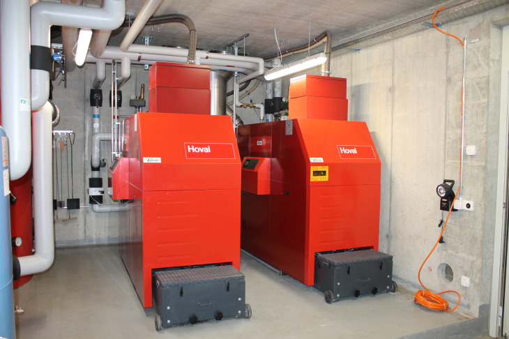 L’edificio precedente era riscaldato a olio combustibile, ma per il Fiore di pietra il legno sembra essere una soluzione nettamente migliore. Chiaramente anche il pellet deve essere trasportato in quota con il treno. Ma, a maggior ragione in un contesto tanto imponente, il rispetto della natura ha una rilevanza notevole, che porta a prediligere una fonte energetica rinnovabile CO₂ neutrale. Nel Fiore di pietra sono installate due caldaie Hoval BioLyt (160) che possono raggiungere una potenza termica di 320 kW. A seconda della quantità di calore richiesta ne viene accesa una sola o entrambe. Due accumulatori tampone Hoval EnerVal (3000) completano alla perfezione il sistema: tengono pronta una riserva di energia e la forniscono direttamente quando necessario, in modo che la caldaia a pellet non debba intervenire ogni volta che variano i consumi, accendersi e spegnersi troppo spesso. Nella modalità di funzionamento continuo garantiscono la massima efficienza.
