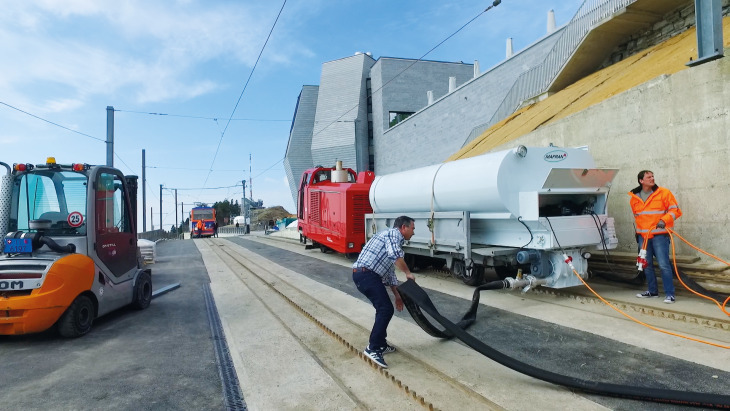 Perché il pellet e non il cippato? Il pellet fornisce più energia per metro cubo e occupa molto meno spazio nel deposito perché compatto e facilmente trasportabile. Queste caratteristiche ne fanno la soluzione ideale per un luogo così remoto: per coprire il fabbisogno termico annuale, calcolato in 400 MWh, si devono in ogni caso trasportare sul Monte Generoso da 90 a 100 tonnellate di pellet. Il serbatoio del combustibile viene scaricato dal camion e trasferito sul treno. Per scaricare il pellet dal treno e dal serbatoio si utilizza una pompa a pressione installata all’ingresso del deposito.