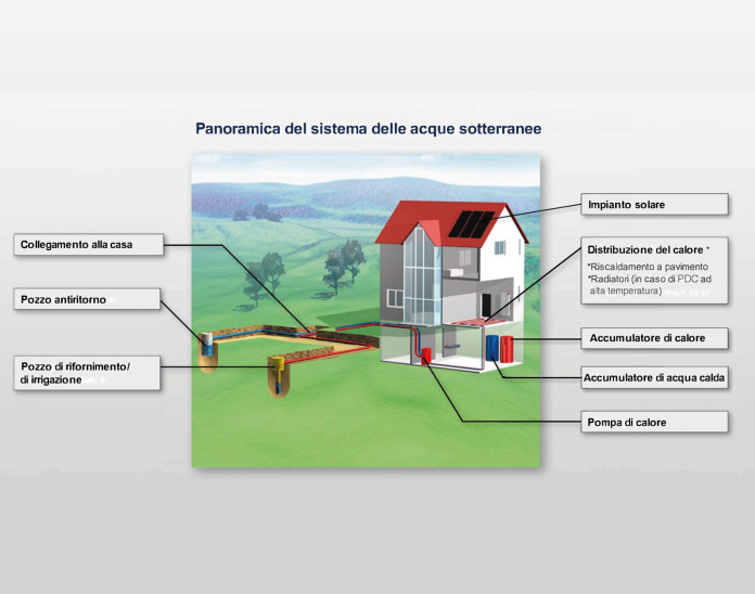 Le pompe di calore con sonda geotermica (Hoval Thermalia) recuperano il calore dal terreno. Ad esempio possono utilizzare l’acqua di falda che, in aree ricche di acqua, si trova direttamente sotto la superficie terrestre. A differenza dell’aria esterna utilizzata dalle pompe di calore aria/acqua, le temperature dell’acqua di falda rimangono relativamente costanti durante tutto l’anno. Se le temperature della falda acquifera rimangono in media fra 9 e 12 °C, le pompe di calore ad acqua di falda possono funzionare in maniera molto efficiente.